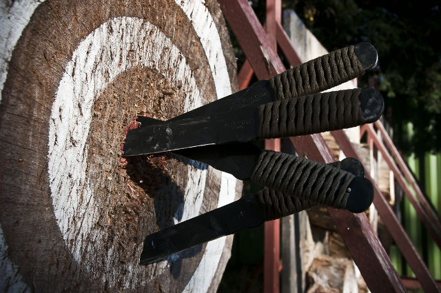 Если идея жать гашетку или дёргать тетиву не интригует достаточно сильно, предлагаем попробовать научиться метать нож. И ключевое слово здесь именно «научиться». Это вам не филиппинское кино, где герои направо-налево швыряют столовые ножи и вилки, поражая оппонентов своей изобретательностью и сноровкой. В реальной жизни метнуть нож точно в цель – задача не из простых, для новичка уж точно. Для этого дела нужно быть достаточно ловким и проворным. И обязательно очень спокойным. Толкуйте эти слова как хотите, но похоже, что нож чувствует, когда человек нервничает, и назло летит туда, куда его совсем не просят. Поэтому смиритесь с тем фактом, что поначалу он не захочет втыкаться в мишень, как положено. Прежде следует научиться следить за дыханием, расслаблять тело и сосредотачивать ум для совершения успешного броска. При этом и рука должна быть твёрдой, про физическую составляющую забывать не стоит. Метание ножа в этом плане можно сравнить, например, с восточными единоборствами. Понятное дело, что вам не потребуется махать ногами перед броском. Сближает столь разные виды спорта только необходимая гармония тела и духа, психическое равновесие вкупе с физической силой.