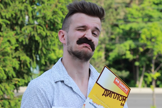 О, усы! Больная тема в прямом и переносном смысле. Когда снимали первый выпуск, мне посоветовали наклеить их на скотч. А это первый выпуск – либо я работаю там, либо не работаю. И начали усы отклеиваться. Это были съёмки в спортзале. И мне настолько было плохо. Я думал, что всё, я провалился. Постоянно отклеивались, я их постоянно придерживал, это был такой кошмар. Я отчаялся до такой степени, что думал – во второй раз приклею их на суперклей. Пойду в магазин, приклею их на суперклей, и мне плевать, что будет с моей кожей. Настолько я был одержим. Сейчас всё хорошо. У меня есть дилер, который поставляет мне клей. Всё нормально держится. А когда всё нормально держится, это не может не радовать молодого человека.