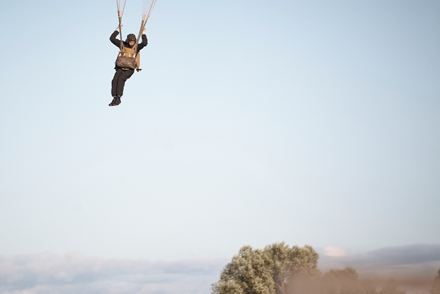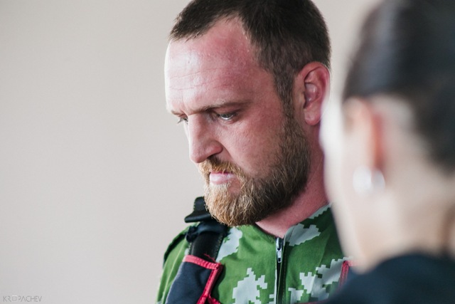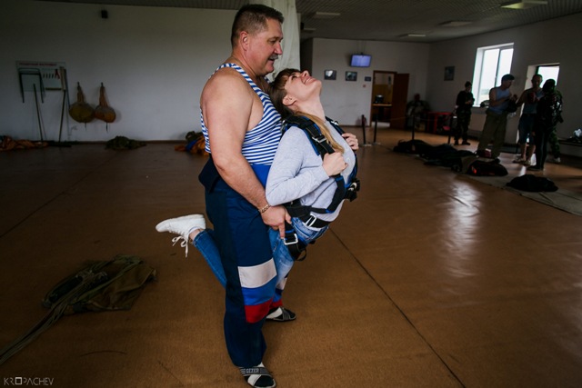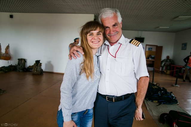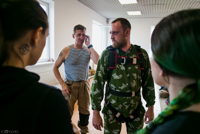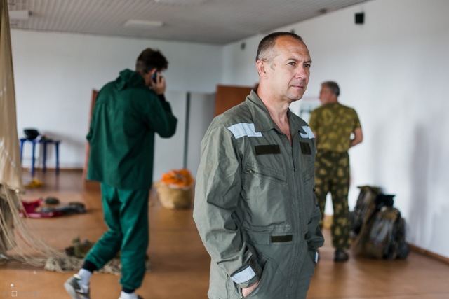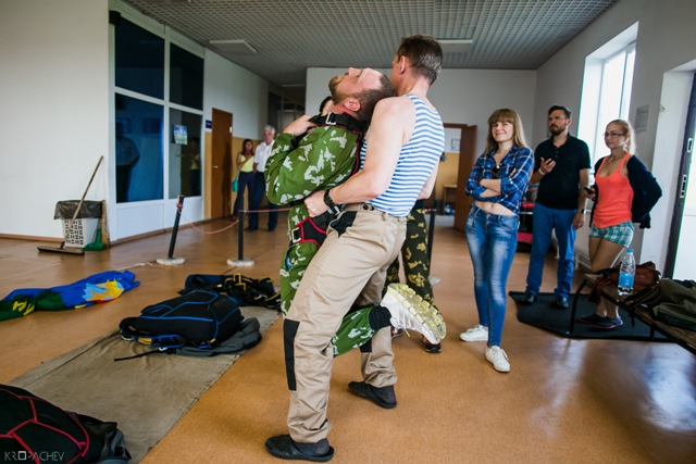 Это мой идол – Олег Дрягин, инструктор, на которого молятся многие прыгуны – сильнейший человек, очень спокойный и решительный, добрый и все понимающий – он усаживал на мне всю парашютную обвязку, как будто пеленал – он и прыгал со мной в небесную бездну, а потом устраивал виражи над землей. Силу в руках имеет немереную.