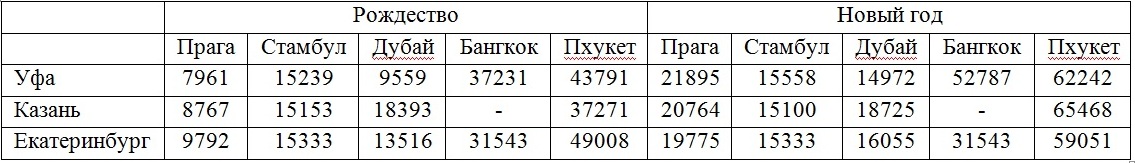 Международный аэропорт «Уфа» второй год подряд признаётся лучшим в стране среди аэропортов с пассажиропотоком до 4 млн человек в год. А ещё лучшим в стране аэропортом по итогам пассажирского голосования. Тем не менее в поиске выгодных предложений мы рассматриваем вылеты из соседних Казани и Екатеринбурга. Лететь будем в самый туристический пик: отмечать католическое Рождество и встречать новый 2018 год. Европа, Азия, жди нас! А точнее – Прага, Стамбул, Дубай, Бангкок и Пхукет. Полетели?