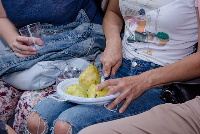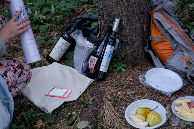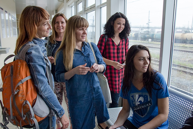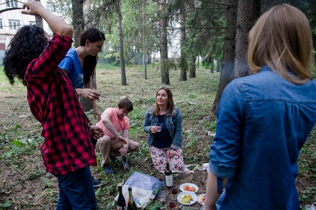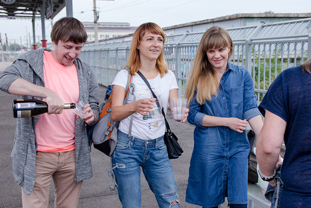 Последние минуты перед высадкой наслаждались шампанским с оттенками груши, яблока и персика. Его бы пить из длинных фужеров, смотря на закат, закинув ноги на любимого и мечтая о южном солнце. Но мы дружною толпою выкатываемся из электрички на демский перрон для небольшой фотосессии с пластиковыми стаканчиками наперевес.