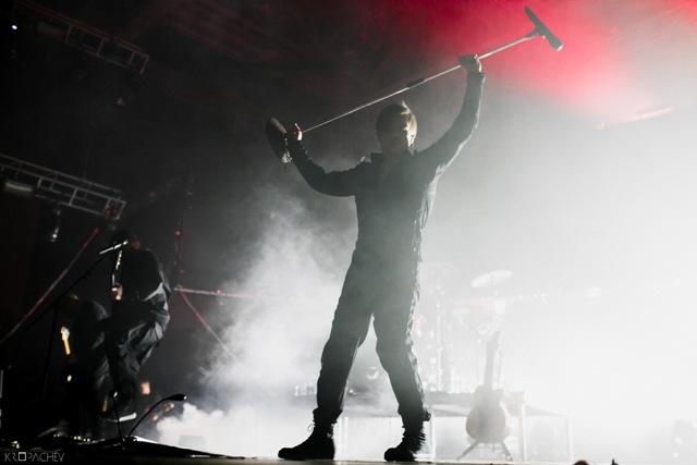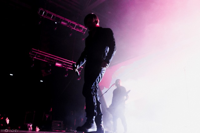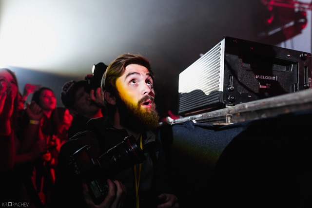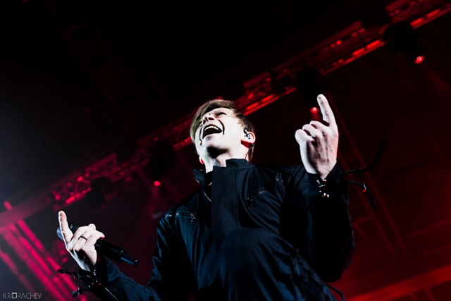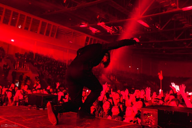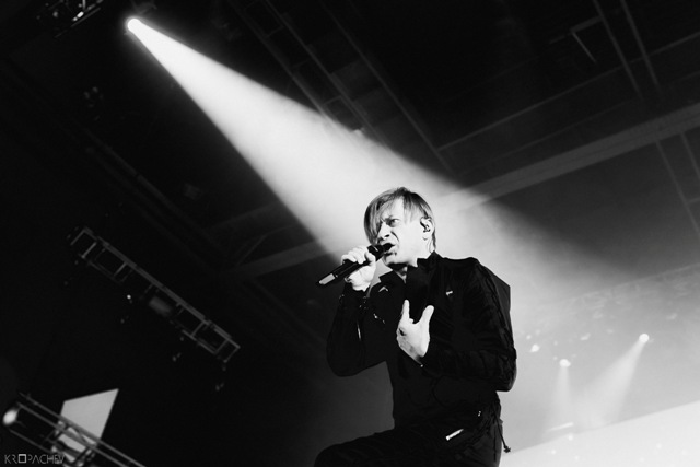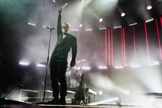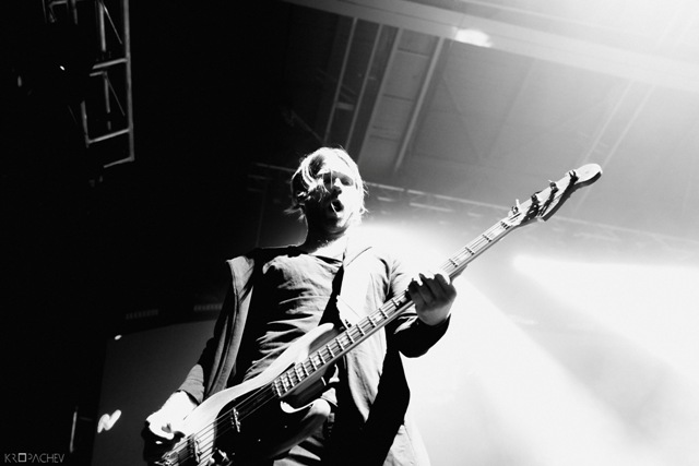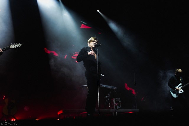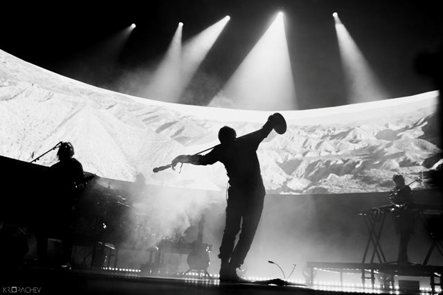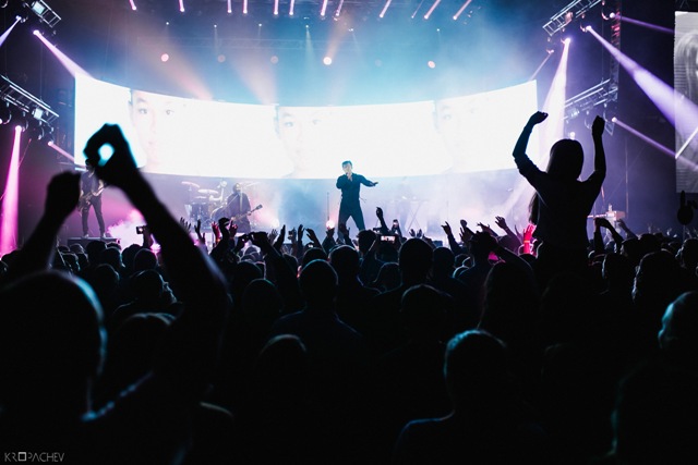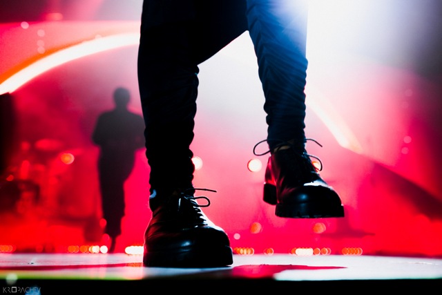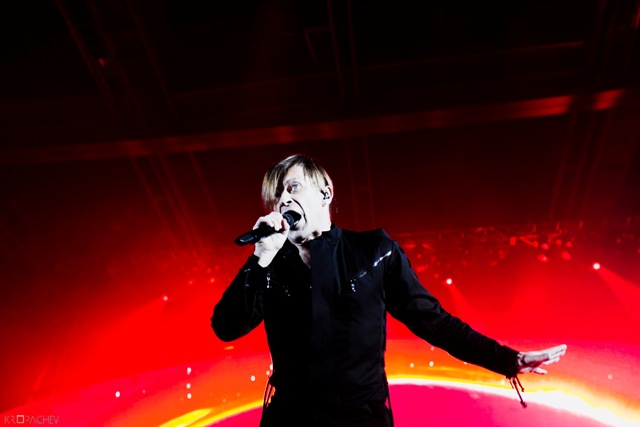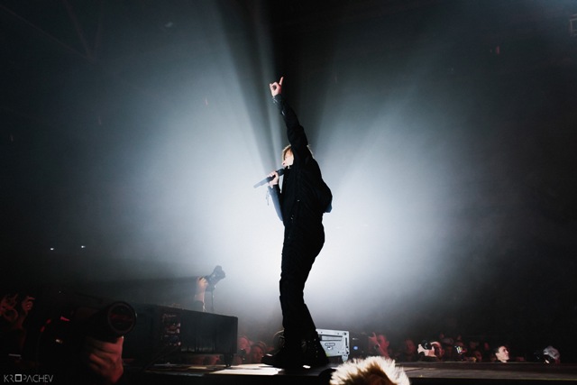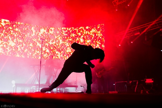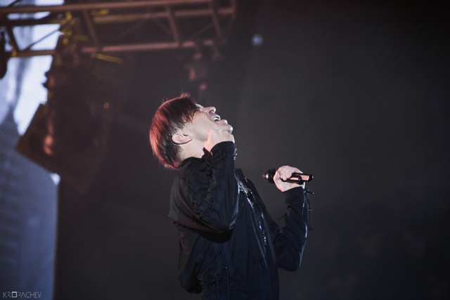В какой-то момент свет в зале наконец-то погас, а на сцене обнаружился экранный купол, по которому понеслись звезды. Космическое путешествие стремительно приближалось к Земле. В момент прибытия на планету под оглушительный рев толпы вышли музыканты. Лева Би-2 изобразил изящный реверанс, поприветствовав толпу, и стартовала песня «Летчик» - насыщенная пластиковыми синтезаторными эффектами, грузными ударными и холодными гитарными всплесками. Насыщенный неоновый свет жадно хватал фигуры музыкантов – визуальная сторона выступления была продумана очень эффектно. Лева Би-2, одетый в некое подобие комбинезона, и правда напоминал летчика, а провода наушников, торчащие около головы, только добавляли футуристичности в этот образ.