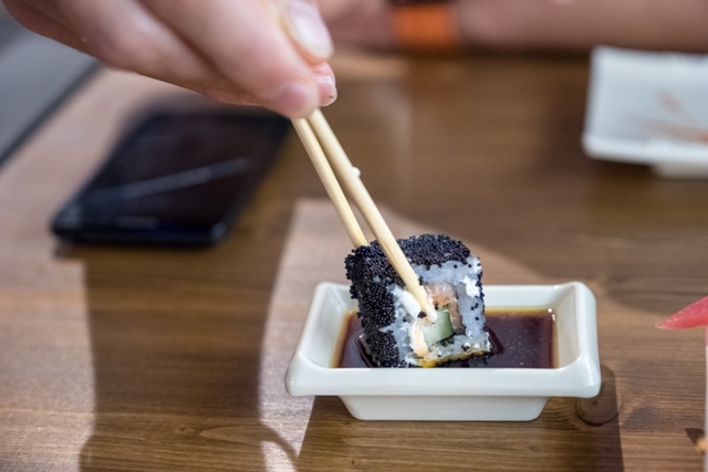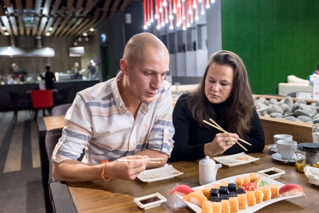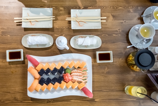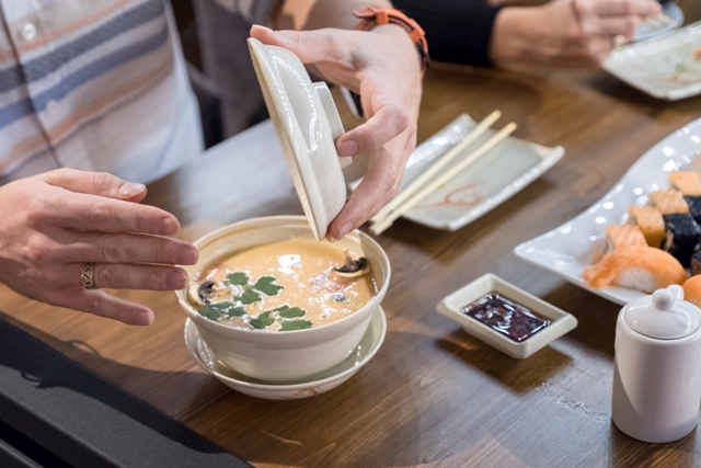 МуШу встретил нас традиционной японской кухней: сашими, суши, роллы, различные супы и необычные десерты. Здесь пришлось максимально нагрузить официанта, которая помогла нам собрать сет из роллов, суши и дополнила всё сашими из креветок. Ещё я заказал для себя Том-Ям, ведь что может быть прекраснее маленького кусочка Тайланда в зимний морозный день?