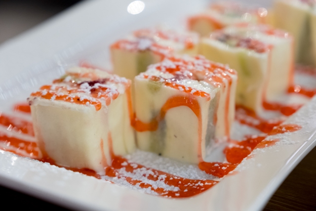 В качестве десерта (ведь в конце ужина должен быть десерт, правда?) мы решили попробовать роллы из рисового теста с сыром Маскарпоне, бананом, киви и чем-то ягодным. Надо сказать, что с десертом мы ни капли не прогадали. Он не просто порадовал, а немного даже удивил: прекрасное сочетание фруктов и нежного сыра.