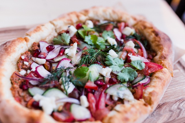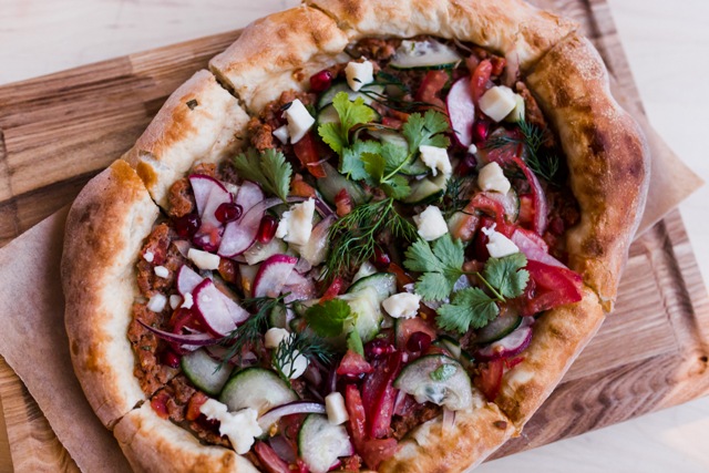 Лепешка с бараниной, свежим салатом и восточными специями – это теперь мое любимое в Биргадене. Меня это блюдо напрочь сбило с толку. Вот мы знаем лахмаджун – тонкая лепешка с мясным фаршем, маринованным луком и лимоном. Мы знаем пиццу. Мы знаем салаты. А здесь все это объединили. Лепешка из прекрасного теста с хрустящими боками, моими любимыми, с бараниной, которую я редко ем, но тут даже не поняла, что это она, пока не сказали. А сверху после запекания лепешки в печи был выложен салат из овощей и редиса – редис это очень приятно в январе. Господи, мои любимые углеводы. Так важно после новогодних разносолов внести в свой рацион нотку свежести и простоты.