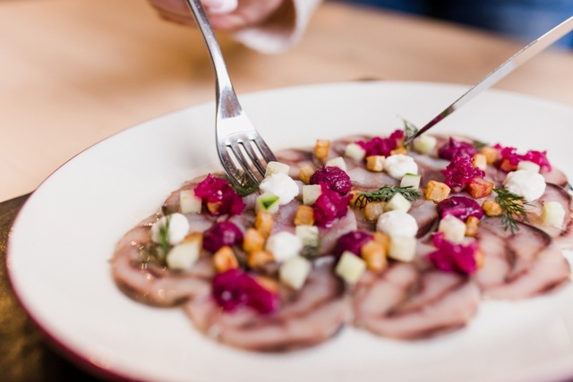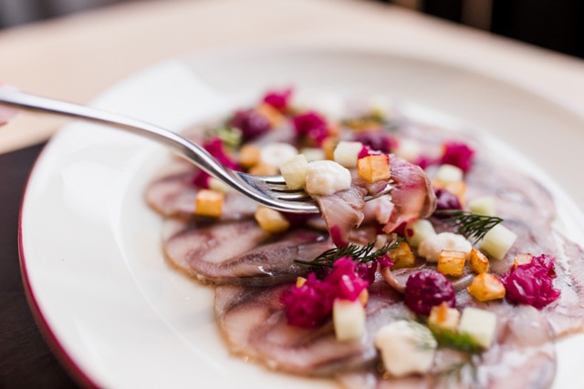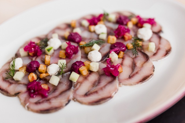Начала я с карпаччо из сельди. Тут сразу все было понятно – вариация салата «сельдь под шубой», но без шубы. Вкрапления кубиков жареного картофеля, немного огурцов, сливочного и свекольного хрена мягко дополняют основной вкус блюда – вкус первосортной маринованной сельди, под которую хочется «а не хлопнуть ли нам по рюмашке?!» Подходит в качестве начала трапезы, чтобы еще крепче разогнать аппетит – мне сразу же захотелось выпить и съесть котелок картошки в масле и зелени, но я человек волевой.