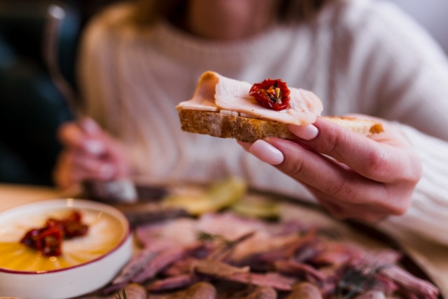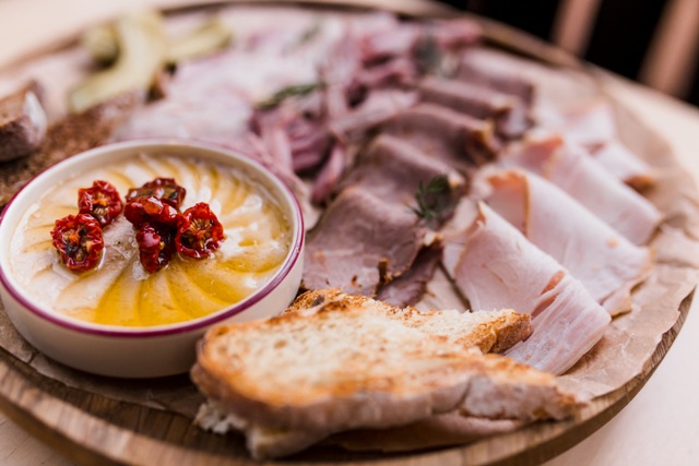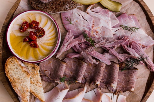 А теперь белок! Мясную тарелку, пожалуйста. Вот это я люблю – мой тренер расцеловал бы меня за такой выбор – мясо и ничего лишнего. У нас тут говядина, утка и индейка, маринованные огурчики, вяленые томаты (обожаю) и внимание! – утиный паштет под тонкой пленочкой оливкового масла. Вот эту тарелку я легко съем одна и попрошу еще по одной простой причине – мягкий нежный вкус мяса, без лишних специй и оттенков – ешь мясо, как пьешь воду. Все гениальное просто.