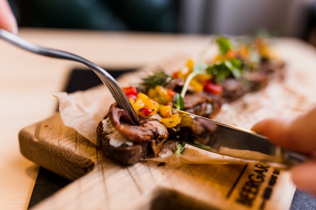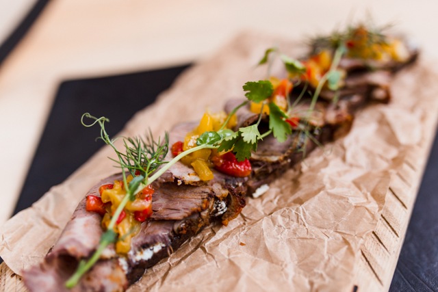 Продолжила тартином с пастрами из говяжьей грудинки. Давайте называть вещи своими именами: это же бутерброд. А я обожаю бутерброды с тех пор, как вернулась из годовалого путешествия по Германии, и этот – один из моих любимых. Здесь непременны три ингредиента – черный хлеб, мясо, болгарский перец. Способы приготовления такого бутерброда, тартина или брускеты могут отличаться – в данном случае ломоть хлеба был слегка обжарен с небольшим добавлением масла и намазан копченой рикоттой. Ломтики говяжьей грудинки обкладываются тартаром из печеного болгарского перца. Немного ростков зеленого горошка и петрушки – и можно заказывать себе бокальчик красного сухого. Чтоб вы знали – я частенько люблю начинать так свой обед.