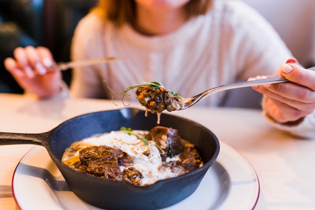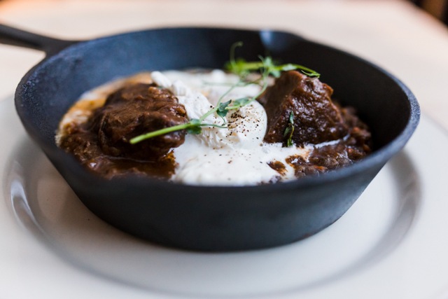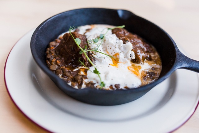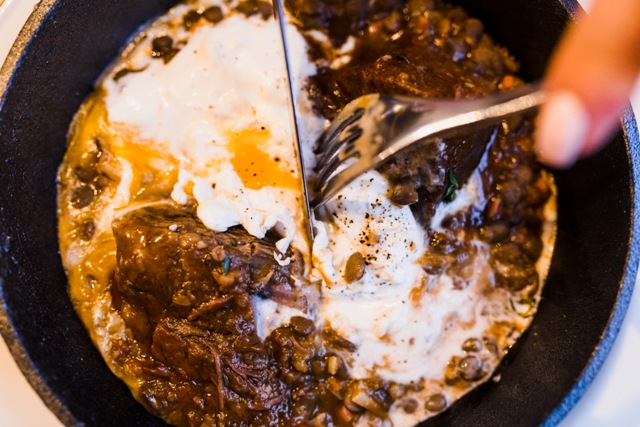 И напоследок, королева вечеринки – томленая говяжья грудинка, которая распадается на атомы среди зеленой чечевицы. Ее нужно обмакнуть в волокна яйца пашот и завернуть в объятья страчателлы – это такой сыр, который в горячей чечевице, разумеется, начинает тянуться, как жаркая итальянская ночь. Здесь я закатываю глаза и мычу – это самое зимнее блюдо, от которого тепло не только в животе, но и на душе.