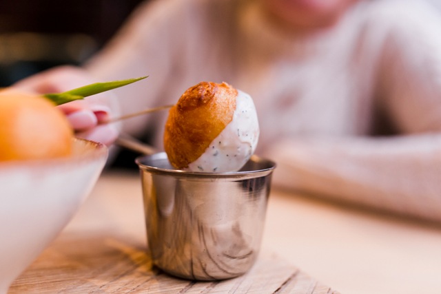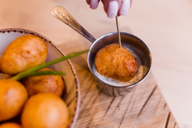 Начну с пивных пончиков, которые делаются из чеддера. Прекрасное сырное тесто, обжаренное во фритюре с добавлением жгучего халапеньо. От тебя требуются всего 4 действия – нанизать на шпажку, окунуть в сметанный соус, съесть, запить. Повторить, пока не кончится. Сырные пончики – это общеизвестный вариант женской закуски к пиву, работающий всегда.