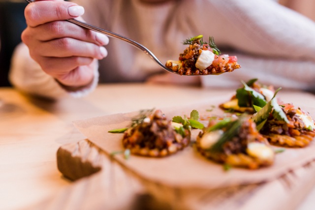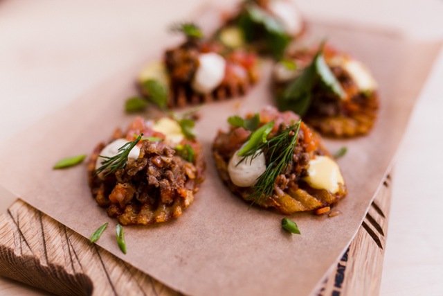 А теперь вкусовая бомба – картофельные решетки с говяжьим рагу, сальсой и двумя видами соусов. Это о ч е н ь в к у с н о. Я даже не ожидала от такого простого на вид блюда. На обжаренном во фритюре ломтике картофеля аккуратно размещена щепоть мясного рагу, немного томатной сальсы и сырных соусов. Понимаете, да? Повар просто совместил картошку, мясо, томат и сыр. Есть это надо очень быстро, пока картофельный ломтик хрустящ и не заплыл соками.