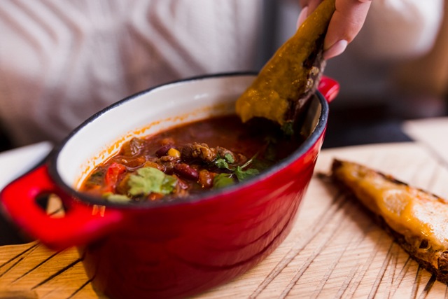 Кстати, обед. У нас дальше будут еще закуски, но немного из другой оперы, давайте расскажу про суп. Я мечтала приготовить дома чили кон карне с тех пор, как в какой-то кулинарной передаче его увидела. Это мексиканское блюдо бедняков, и пусть вас не смущает такое прозвище – лично для меня нет ничего лучше блюд, которые придумал народ из того, что было, что дала земля. В Мексике она дала мясо, фасоль, перец, лук, кукурузу, зелень и томаты. По большому счету это соус болоньезе с фасолью, кукурузой и большим количеством болгарского перца и зелени. Суп получается густым, как гуляш (а вы знаете, что гуляш, это суп, да?), в Мексике его едят с помощью подсушенных кукурузных лепешек. В данном случае его дополняют гренки с расплавленным сыром и для меня это спорное решение, потому что по сыру скатывается вся гуща, ничего этой гренкой не подденешь, как ложкой. Но все равно божественно – просто ешьте чили кон карне ложкой и закусывайте гренкой. Мне сразу стало жарко и захотелось пива. И оно не заставило себя ждать.