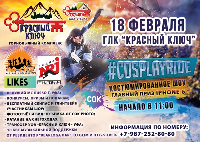 Победитель шоу, чей образ будет признан лучшим, станет обладателем IPhone 6, остальные гарантировано получат бесплатный скипас и горячий глинтвейн. Все присутствующие смогут принять участие в конкурсах, а также получить призы и подарки от ведущего Руслана Душамбиева (Mc Russo). Участников мероприятия будет ждать креативная фото - и видеосъёмка от СОК Photo, трансфер Уфа-Красный Ключ-Уфа и катание на снегоходах по сниженным ценам. За музыкальную атмосферу будут отвечать 10 кВт качественного звука от резидентов «Bearloga Bar» Dj Glim и Dj G. Silver. Начало в 11 часов.