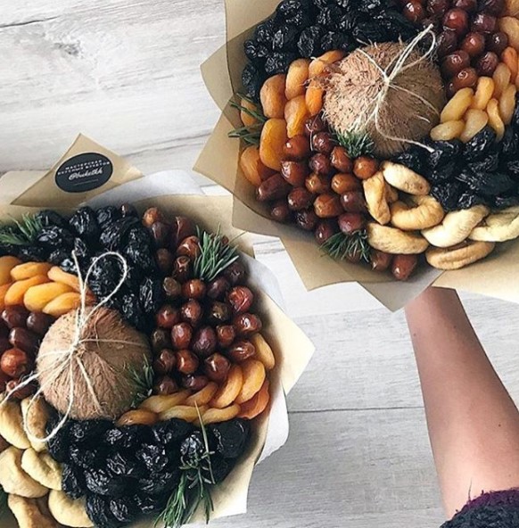 Все в порядке с фантазией у ребят из fantasy.ufa: томаты, сухофрукты, сыр, винишко и даже раки. А вы бы обрадовались такому букетику?