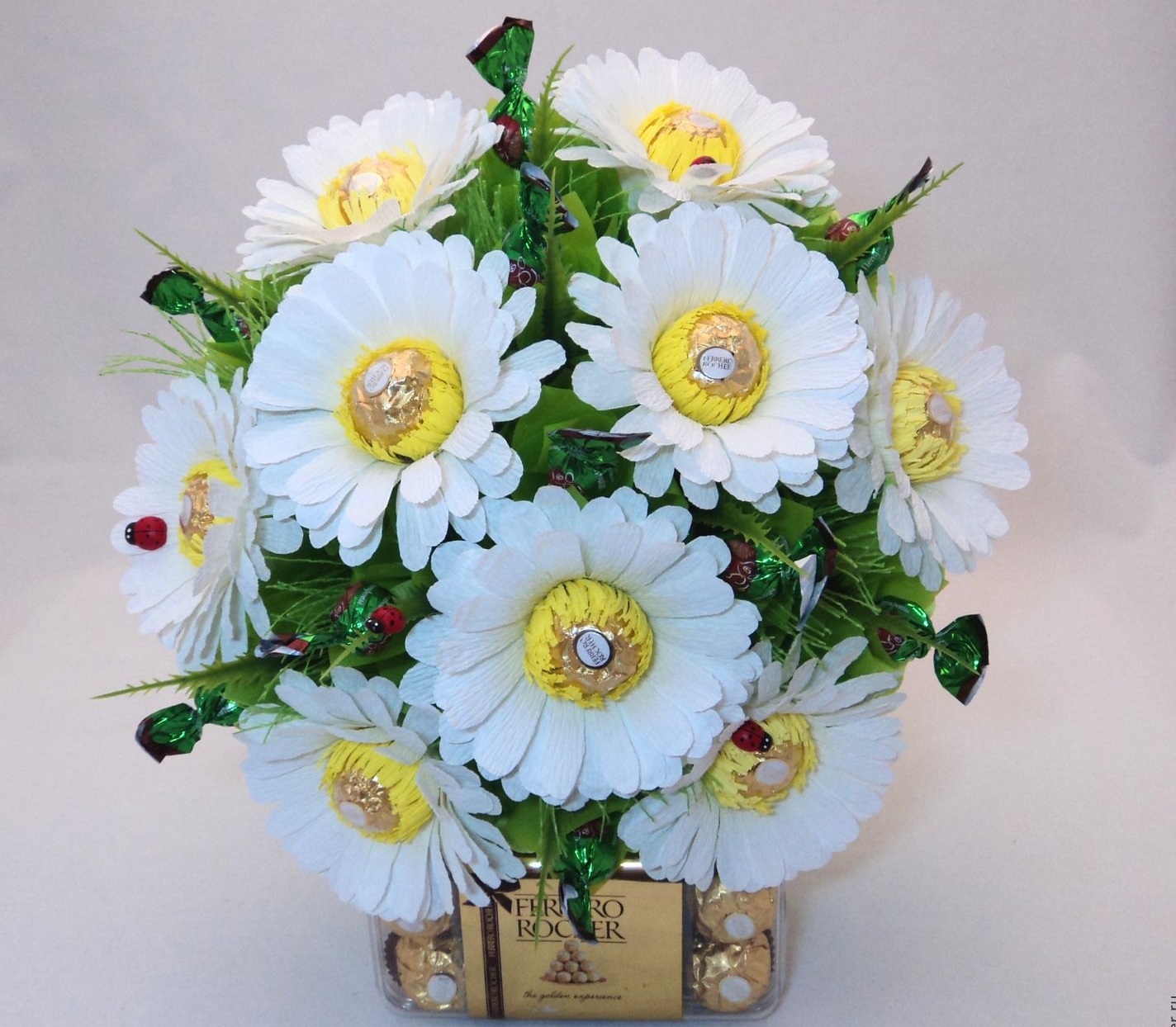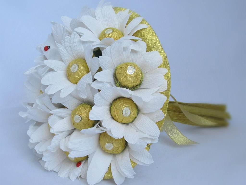 Хорошей альтернативой букету из чая станет конфетный: знаем-знаем, что тема изъезженная, но посмотрите на это чудо из бумаги Елены Креховой. А внутри ещё и всеми любимые рафаэлки!