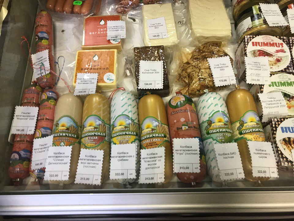 А вот вегетарианскую колбасу – самую логичную замену мясу – в магазинах у дома найти сложновато. Мало того, её не отыщешь даже в популярных эко-магазинах города. В центре нам удалось обнаружить пшеничную краснодарскую колбасу в магазине «Здоровое питание» на Гоголя, 25. Тут ещё мы нашли эко-сосиски, паштет, хумус, соевый сыр и даже фарш из сейтана. Вкус после привычной колбасы – на любителя, но в сочетании с овощами и зеленью раскрывается интересно.