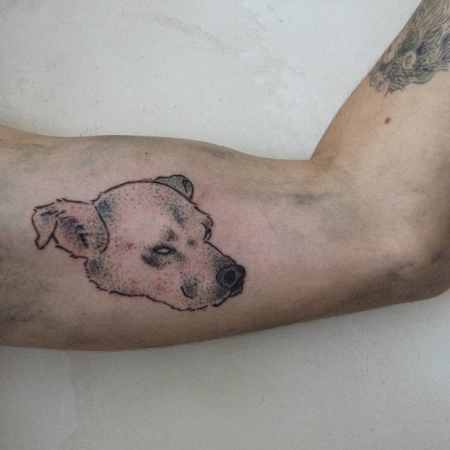 Я, конечно, наслышан от знакомых мастеров историй о необычных заказах, но особого ужаса у меня ещё не было. Самая интересная из моих работ, наверно, это тату с головой пса – хозяин набил себе вот такой вот портрет своей 12-летней собаки.