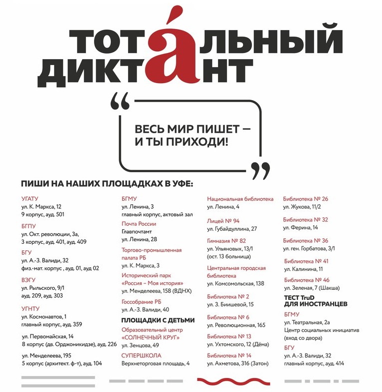 В Уфе местом проведения акции станут 27 площадок для Тотального диктанта и 2 для TruD – специального теста для людей, изучающих русский язык как иностранный. Среди приглашённых чтецов (ещё их называют диктаторами) – профессора, учителя и медийные личности.