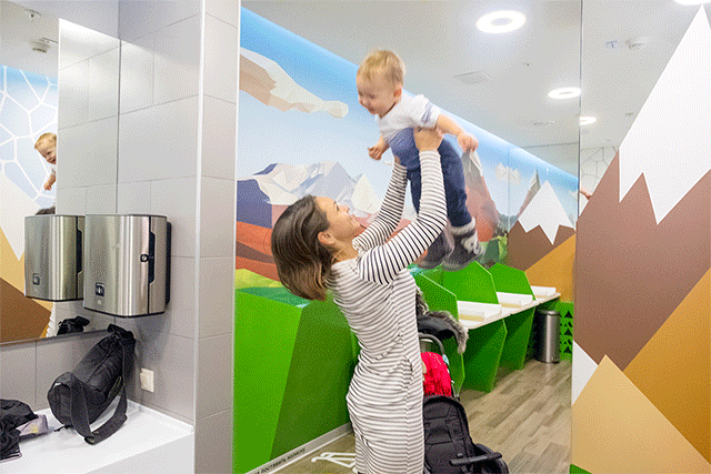 Здесь можно спокойно раздеться, сходить в туалет, помыть руки себе и малышу благодаря удобным детским подставкам. Поправить макияж, расчесаться, спокойно привести ребенка, а потом и себя в порядок, пока ваше чадо будет сидеть прямо перед вами, возможно даже потанцевать и подбросить малыша на радостях.