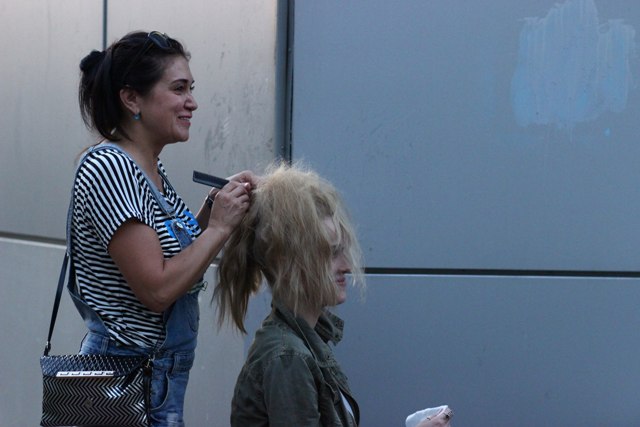 Ляйсан: «На съемках было очень жарко, у актеров тек грим. Приходилось раз за разом поправлять или новый наносить. Плюс, если, например, седину делаешь, то она в течение всех съемок должна быть одинаковой. То же самое и со стрижкой, и шрамом. Были такие моменты, что царапина засыхала и все переделывали заново. С мейк-апом было полегче. Все артисты молодые, поэтому мы отказались от агрессивного, напротив, выбрали более нежный и естественный макияж».