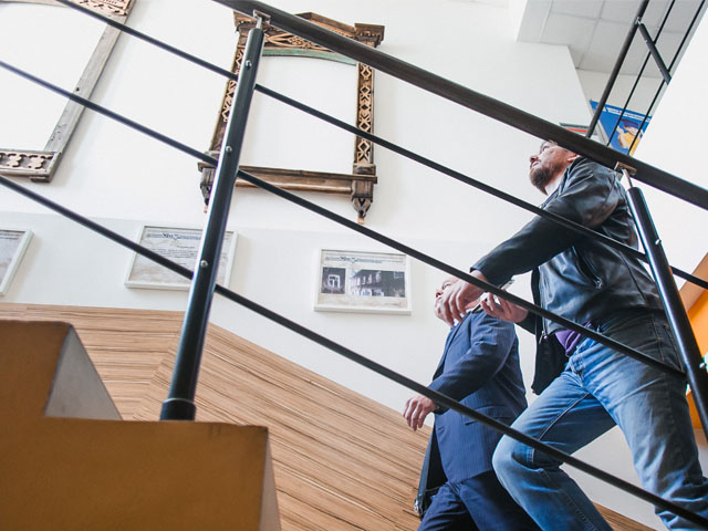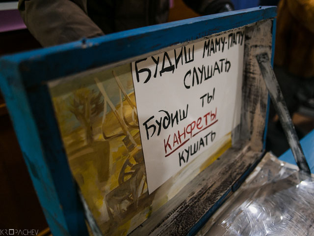 А.В.: Вот смотрите, деревянные резные наличники. Этих домов уже нет, а наличники сохранены. У каждого есть своя история, вот здесь на бумаге. Этим мы берём. Душевностью. Поставили сундук. А знаешь, сколько ему лет? Сто лет ему. Тому насосу 120 лет. Через эти элементы мы как будто звеньями цепляем людей. Вот тумба (показывает на классическую афишную тумбу). Думали, как размещать объявления. Сделали тумбу, как в те времена. А могли сделать просто доску объявлений.