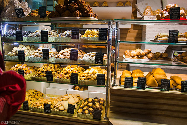Вот лавка с хлебом – как и в продуктовых магазинах, супермаркетах хлеб в конце. У нас главное преимущество, что здесь всё свежее, особенно утром.