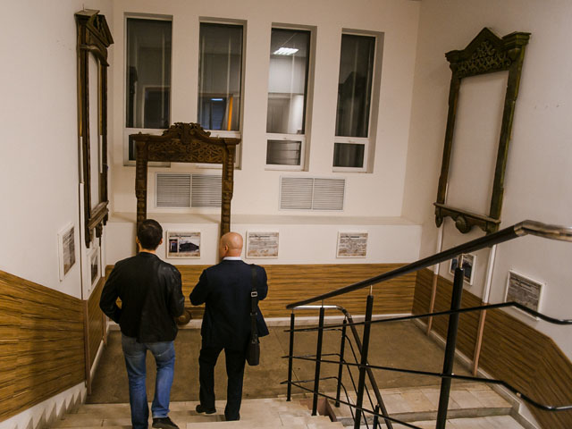 Артур Валерьевич: Про парадный вход скажу вначале несколько слов. Вот здесь, извините за выражение, был прыщ. Он выходил из подвала и, таким образом, закрывал входную группу. Мы прекрасно понимали, что нужно всё менять и хотели сделать портал. Он получился великолепный, большой. Идею заимствовали с ЦТиР «Мир», концепция которого – тоже мой проект. Сделали мы его посередине – не левее, не правее, борьба была за архитектурный облик. Я считаю, что у нас получилось, потому что сейчас все видят эту центральную зону. У нас слева и справа были лестницы, их убрали, центральную одну входную группу сделали.