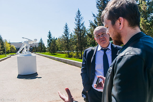А.В.: Этого ничего не было, сделали такую аллею скульптур. Посмотрите, сколько детей сейчас здесь. Такого не было, здесь стояли эти летние кафе с пьяными людьми, бильярдные, сауна. А какой отличный каток у нас здесь зимой. Вот ещё, например, интересный факт: Ирек Ишмухаметович жалуется, что у нас вандализм в Уфе. А вот на наших скульптурах есть хоть одна черточка? Нет. У нас контингент здесь поменялся.