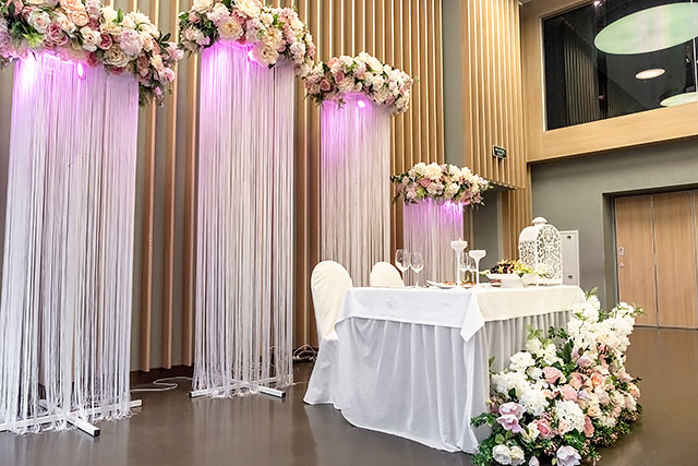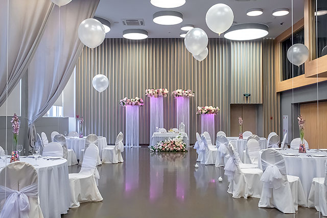 При бронировании банкетного зала в данном комплексе вы автоматически получаете в подарок на сутки номер для брачной ночи. Там вас ожидают красиво украшенные апартаменты, фрукты и шампанское. Идеальный вариант, чтобы за закрытыми дверями пересчитать подаренные на свадьбу деньги. Но погодите про вечер, давайте еще поговорим про свадебный день.